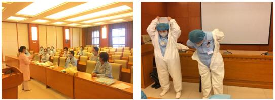加强实验室安全管理,确保在实验的各个环节严格遵守防护准则。防微杜渐,在院感办的协助下邀请赵静护士长对科室人员进行三级防护装备的穿戴演练。