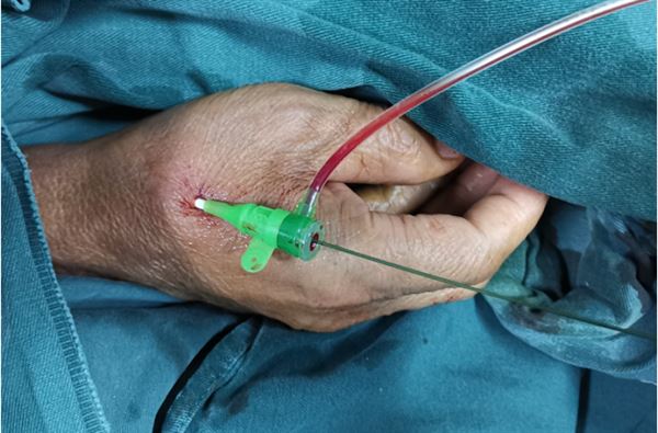 远端桡动脉穿刺部位为“鼻烟壶区”此部位寻找很简单,充分伸展拇指,在拇长伸肌腱及拇短伸肌腱与伸肌支持带形成一凹,即“鼻烟壶区”。此区远端桡动脉相对粗大固定,且位于拇指动脉近心端,即使出现桡动脉闭塞并发症时亦不会影响拇指的供血。