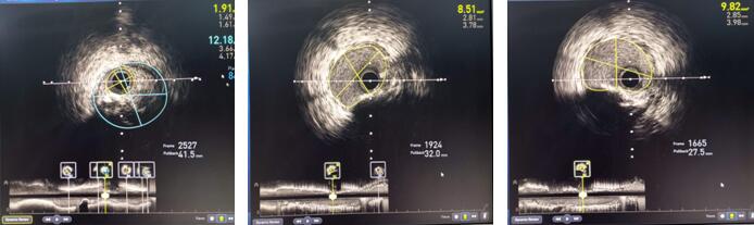 6月16日左梅主任再次采用了血管内超声(IVUS)指导零造影剂支架植入。指引导管、指引导丝顺利到位,通过IVUS导管送入LAD罪犯血管,测LAD最小管腔面积1.96mm2,斑块负荷84%,远端管腔直径4mm,近端血管存在明显的负性重构,管腔直径约3.5mm,通过对开口到各分支距离的精确测量,选择了3.5*38mm的支架植入,最终对病变部位进行了精准的完全覆盖,复测IVUS看到支架内局部贴壁不良及膨胀不全,再次后扩张,IVUS最终检测支架贴壁膨胀良好,最小管腔面积9.82mm2,成功对该患者实施了支架植入,解除冠脉狭窄,恢复了正常血流。