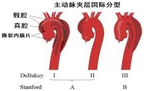 主动脉夹层最常用的分型或分类系统为DeBakey分型和Standford分型,根据夹层的起源及受累的部位分为三型: