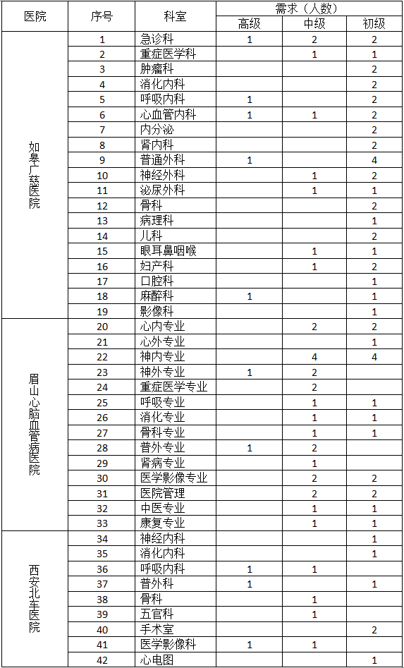 因业务发展需要,现以上医院面向社会招聘各专业临床医师,招聘条件、招聘岗位及招聘人数如下:
