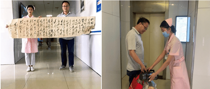 当我们不能预测患者想要什么,就无法在患者沮丧、痛苦和悲伤时表示同情,也无法进行灵魂与灵魂的交流,每个生命都是独特的,我们需要带着尊重、谦卑、好奇的心态,陪伴每一个人去探索生命的神秘之处,以情说话、带情倾听、用情照护,用爱陪伴。当我们面对患者时就像面对自己的家人一般,当患者孤独无助时,握住患者的手,做个有温度的护士,给患者温暖、光明、力量。在接下来的住院期间,李叔叔每次见到我都会亲切的叫到小孙你上班啦!做为一名新入职护士,我感受到了李叔叔的真诚,也体会到只要我们做出了值得患者尊重的事情,就会赢得患者和家属更多的理解和尊重。李叔叔对中医科全体护士给予高度赞扬,他谈到在这里住院有了不一样的感受,虽然在医院却有了在家的感觉,感受到了如同家人般的温暖,出院时擅长书法的李叔叔送了我们一幅亲笔字画,其实我们只是做了我们应该的工作,却赢得了李叔叔如此的信赖,这不仅是对我们工作的认可与肯定,更是一种鞭策。