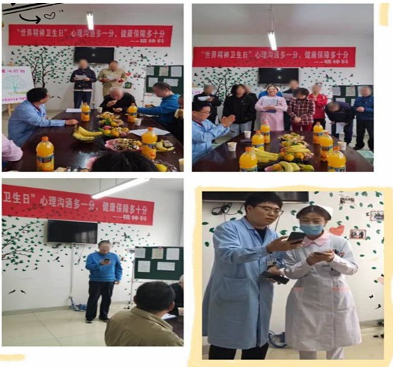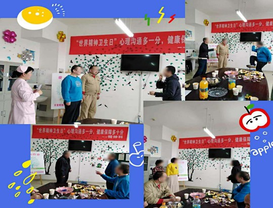 下午2点30分在精神科活动室举办以世界精神卫生日“心里沟通多一份,健康保障多十分”活动,医务人员为患者准备了饮料、糕点、瓜子、花生等爱心食品,同时也非常感谢为我们科患者献出爱心的马学红、龚蓉两位同学(实习生),她们在此次活动中也为患者准备了爱心礼物,表达了她们对患者的爱。