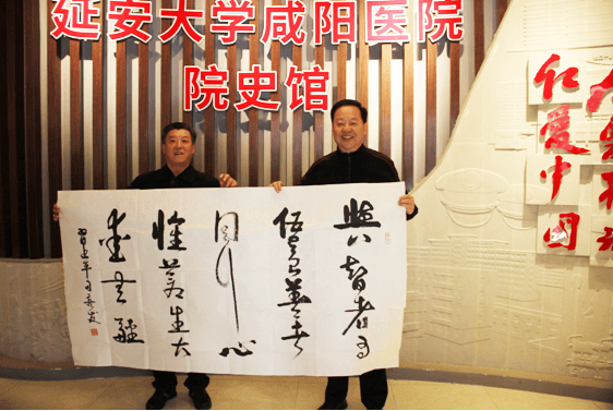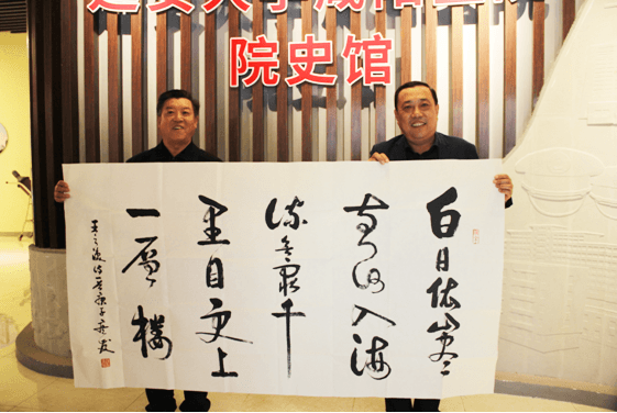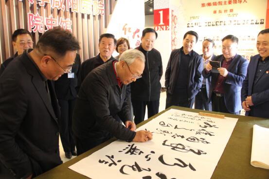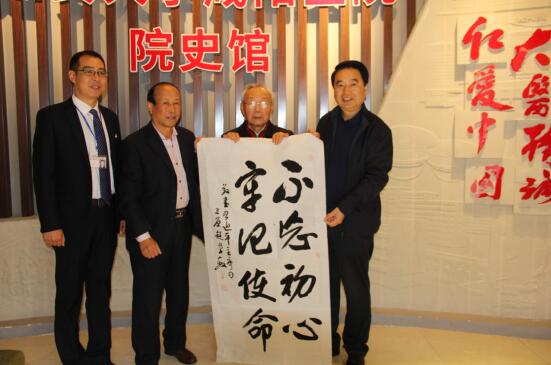 中铁建总公司一行领导来院后先后参观了石头题记、院史馆、外科病院、脑血管病院、院史墙等。参观石头题记和院史墙记后,各位老领导指出这两篇题记高度浓缩了医院的发展历程和重大事件,感情丰富,文字工整,具有很高的造诣。在参观院史馆过程中,各位领导兴致勃勃,认真聆听工作人员的讲解,每当看到那些曾经指挥过,曾经战斗过的地方的照片和文字记载时,老领导不时为我们讲述一段当时发生的感人故事。在第二展区看到在抗美援朝战争中缴获的军用冰箱时,赵广发总裁讲到“在抗美援朝战争中,铁道兵广大官兵付出了很大的代价,也为打赢战争做出了重要贡献”。在参观沙盘时,他为我们讲述了建设成昆线、襄渝线过程中可歌可泣的感人故事。老领导的讲话饱含深情,让在场的每一位人员深受教育。参观完院史馆后,中国林业局原副局长、全国政协书画室副主任、中国生态书画院名誉院长赵学敏有感而发,现场为医院题写了“不忘初心 牢记使命”“更上一层楼”等书法作品,中国铁建股份有限公司原总裁、党委副书记、中国书法家协会会员赵广发为医院赠送了《医人》书法作品,为精诚医疗集团董事局主席张群赠送了习近平总书记经典语录“与智者为伍,与善者同行,心怀苍生,大爱无疆”等书法作品。