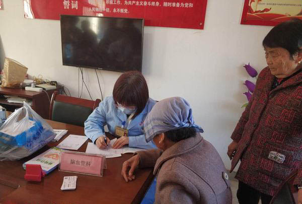 在免费测量血压的长队中,生殖医学科医生黄愈医生及宣传部志愿者耐心地为老乡们进行健康宣教,发送健康宣传资料。