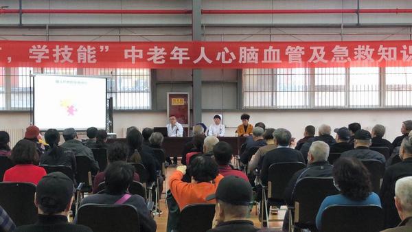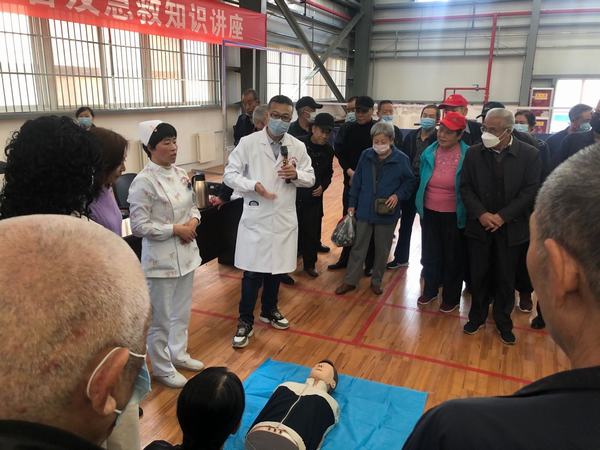 心血管一病区孟庆槐副主任医师为该社区民众讲授了高血压、糖尿病、冠心病等慢性病相关防治知识,同时我院急诊医学科主管护师樊格为大家讲解心肺复苏相关理论知识,并实地操作,生动直观的为广大市民展现了心肺复苏操作要领,受到广大人民群众一致好评。