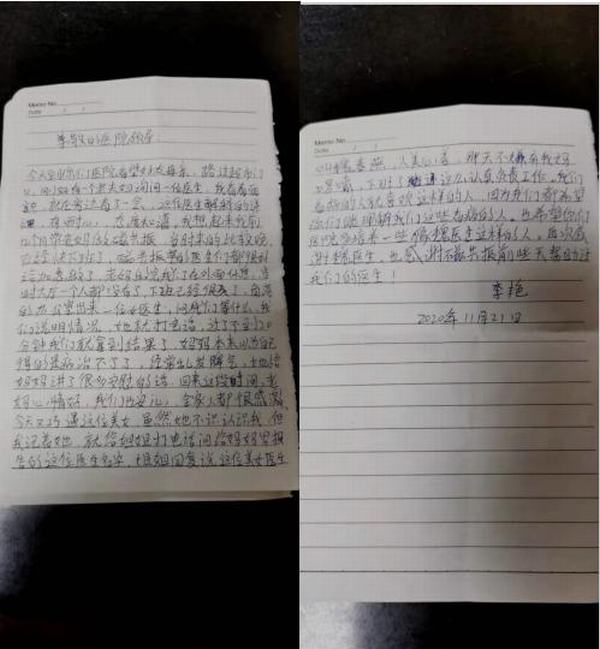 2020年11月21日,一封真诚质朴的感谢信驱散了冬天的寒冷,带着暖阳般的温暖送到了CT/MRI室工作人员的手中,信中内容概括如下:李艳女士在我院探望亲友之时,路过超市门口时听到了一位医生正在向一对老夫妇耐心解释问题,面对此情此景她回想起了她带母亲来我院就诊时的情景,在她们做完检查在下班后空无一人的待诊大厅中焦急等待时,同样是这位医生看到了她们,主动上前询问并帮助她们尽快拿到了就诊结果,并耐心劝慰她和母亲,使得她母亲的心情放松愉快起来。对此,李艳女士经过打听询问后知道了这位医生的名字,她就是延安大学咸阳医院CT/MRI室责任总医师魏春燕同志。在我科室接到信件向魏医生询问时,魏医生谦虚地说道:“其实我们科室很多人都是这样做的,只是我可能被患者和家属注意到了,能收到这封信真的很感动,要向她们表示我真诚的谢意”。
