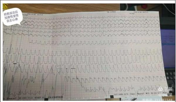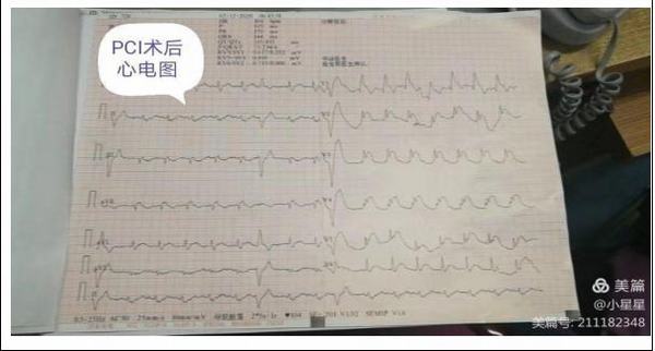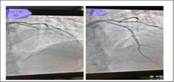 15分钟后,患者王先生在家属的陪同下来到了延安大学咸阳医院心血管病院11楼心六科,在吴医生问诊及查体时患者胸痛再次发作,并于4点20分突然出现四肢抽搐、呼之不应,触摸颈动脉搏动消失,呼吸呈叹息样,立即予以心肺复苏术,心电监测提示心室停搏,与此同时我科杨登魁责任总医师、我院心一科王银涛医师、心二科代雪茹医师、心三科王岩医师、留夜护士陈娜、心七科徐云鹏医师、留夜护士高谦闻讯赶来,并立即投入紧张的抢救过程中,经予持续胸外按压、多次电除颤等治疗后患者于4点40分意识逐渐恢复,心电监测示加速性室性自主心律,抢救成功,而早己就位的导管室同仁也做好了准备工作,并于6点40分成功开通了患者闭塞血管,术后患者生命体征平稳。