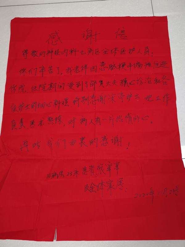 近日,在我科室住院治疗多次的老病患为科室送来了一份温暖又特别的感谢信,信中提到我科医护人员对待病人像亲人一样,说话和气,行动暖心,着重提出科室李长安主任及邵贺主治医师、葛明娟主治医师对待病人的热心、负责,医术更是精益求精。还有在护士长的带领下护士田攀、宋亭及全体医护人员对待病人和蔼可亲、细心呵护。短短几句话,满是患者在多次住院治疗期间的感谢和感动。自活动开展以来,一面面熠熠生辉的锦旗,一封封饱含深情的感谢信,是患者对医护人员仁心仁术的最大肯定,锦旗和感谢信承载着患者对医院的信任和感激,象征着医患情深,收获的不仅仅是一份荣誉,更是一份期望、一份鞭策、一份信任,科室将以此为动力,更加努力地为每位患者提供更加优质的服务。