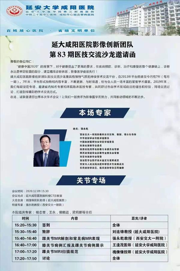 2020年12月9日,延安大学咸阳医院第83期医技交流活动在脑科楼CT/MRI示教室成功举办,延安大学咸阳医院院长助理兼医学影像科主任刘连锋教授主持,特邀西安交大一附院强永乾教授及我院骨一科杨志奎主任、骨二科侯晓进主任、急诊科宋治国主任、超声科吴建军主任及215医院张华文主任团队等临床医师参加本次活动。我院影像及临床医、技、护共60余人参加了本次会议。