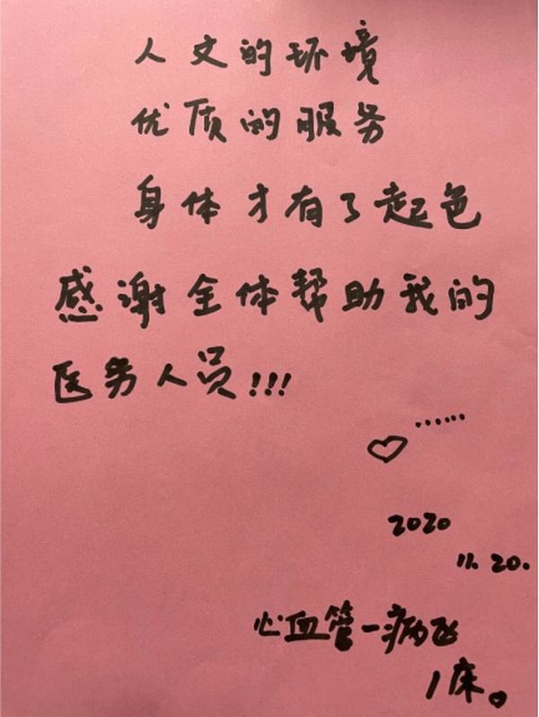 说起人文关怀,心血管内科一病区自2018年起在科主任和护士长的带领下就逐步尝试科室人文建设,从关心关爱患者着手,在科室领导带领及监督下,全体工作人员从自身做起,从小事作起,从患者进入科室的瞬间做起!那个时候科室成员从简单的微笑开始,起立迎接新入院患者,询问患者需求为患者安排床位,陪同患者进入病房,责任护士了解患者的基本状况及需求,为患者提供相应的服务这些基本的护理措施做起;在完成基础护理解除患者病痛的前提下,医护均可以自发的为无家属陪伴的患者接水、买饭,发自内心的陪焦虑患者聊天,鼓励说出自己内心的想法,并积极进行解决!