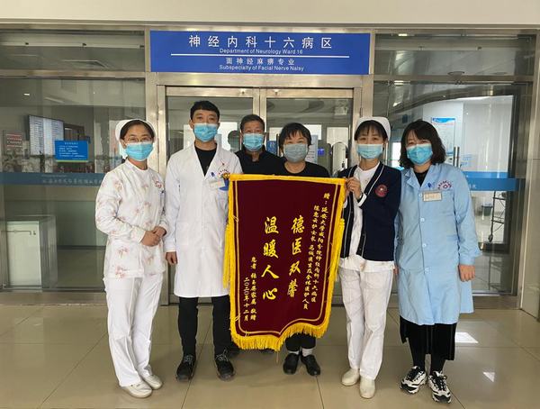 在寒风凛冽的12月14日,科室品牌建设服务有了初步的成绩,得到了患者及家属的认可,此时不再是寒冬腊月而是最美人间四月天。15床张奶奶的家属送来了一面锦旗,对医护人员的感谢溢于言表,张奶奶住院21天,从浅昏迷到意识转清,从言语不能到可简单交流,从大小便失禁到逐步的可控制,从鼻饲饮食到经口饮食,家属从入院时的无助到现在对张奶奶康复的满怀希望......离不开主管医生马诚的精准诊疗,也离不开主管护士张艳妮的悉心护理,医护人员的付出在张奶奶出院的今天得到了最好回报,我们的初心不就是-----医者仁心的践行者。