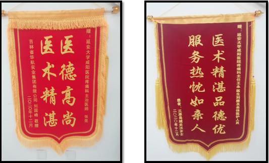 一句问候暖心,一声谢谢诉衷情。精湛的技术将患者疼痛消弥,贴心的服务将患者暖心。患者王大爷,带状疱疹后遗神经痛,加之年事已高,疼痛剧烈且时间长,辗转多地就诊,未见明显效果,一度有轻生念头;慕名来我院后,积极完善相关检查,制定治疗方案,特别是对患者进行的心理疏导,灌输积极向上的思想,让患者打消轻生念头。第一次治疗结束后,由于麻药的作用患者不能行走,急坏老伴。刘医生直接将病人抱回病床上,老伴连连称谢,说:“儿子都没抱过老伴,太谢谢你了,刘医生。”经过细心治疗,患者痊愈出院,家属专程制作锦旗表达感谢。