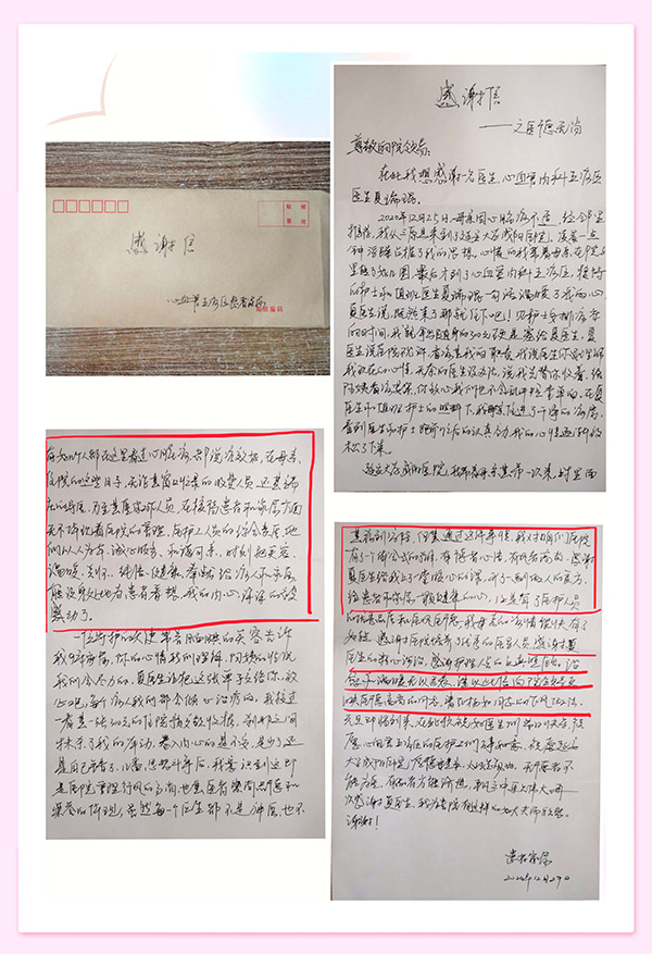 简简单单的一封信,对我们科全体医护人员来说,是一份有份量有温度的肯定。这不仅仅是患者对我们的感谢、赞许与信任,更是对每一位医务人员一点一滴付出的认可,同时也是一种鞭策。我们将继续努力,争取让每一位患者放心,让每一位家属信任。解病人之痛苦,缓家属之担忧。