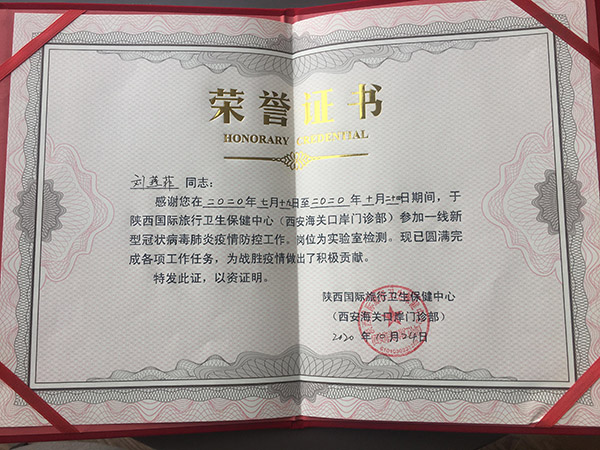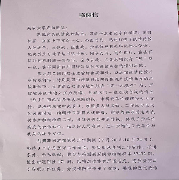 东流飞逝,叶落纷纷……我已结束长达28天的隔离,踏着初雪再一次返回我挚爱的工作岗位。2020年7月18号,陕西省应对新型冠状病毒感染肺炎疫情工作领导小组办公室的统一安排,需我院选派一名实验室检测人员赴西安海关展开支援新冠肺炎核酸检测工作。得知这一消息后,我作为一名党员,感受到这正是需要我们时刻,于是第一时间请战报名,希望医院和科室批准。最终孙主任选派我赴西安海关参加支援,并嘱咐我一定要做好防护,保护好自己。我在心底暗暗下决心,一定顾全大局,艰苦奋斗、脚踏实地、兢兢业业地做好检测工作,不辱使命,圆满完成支援工作,用实际行动诠释一名共产党员的初心与使命。