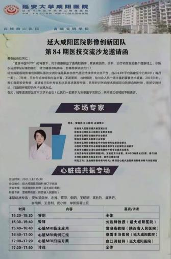 2021年1月12日,在严格做好防疫要求的情况下,延安大学咸阳医院第84期医技护人员交流活动在脑科楼CT/MRI示教室成功举办,延安大学咸阳医院院长助理兼医学影像科主任刘连锋教授主持,特邀陕西省人民医院雷晓燕教授、咸阳市中心医院白云主任及我院吴栋梁院长、心血管病院各病区主任、骨干、超声科王英莉主任、心电图室王芝荣主任等临床与影像医、技、护参加了本次会议。