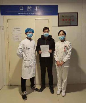 2020年12月30日晚21点30分,室外的温度已达零下,口腔科来了一位患者,双手捂着脸连连喊疼,值班护士史贝见状,立即放下手里的工作,通知值班医生陈少参。并安抚患者:“不要着急,医生马上过来看您!”看着患者裸露在外被冻的通红双手,细心的陈医生为患者倒了杯热水。经诊断病情确认患者为颌面间隙感染,需住院治疗。医生告知其病情危害后,此时的晁先生满面愁容,犹犹豫豫不肯住院。护士与其沟通得知,原来晁先生住院期间没有陪护,心情焦虑,一部分因为病情所担忧,另一部分也因孤身住院而感到不安。护士史贝亲切的说到:“您千万放心,住院期间有什么事随时找我”。患者最终同意住院,经治疗后病情好转,已康复出院。