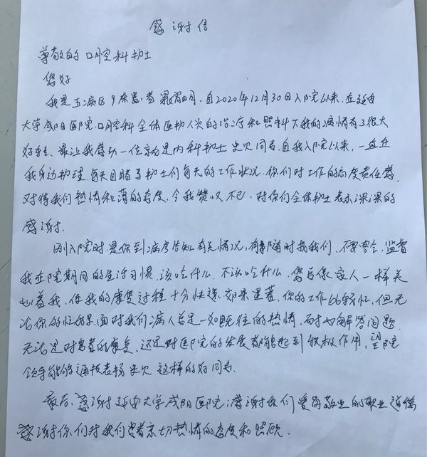 随着疫情的反复,加上南下的寒潮,今年的冬天仿佛变得格外寒冷,口腔科护士史贝收到了一封患者的感谢信,内心无比温暖,事情要从2020年年末说起。