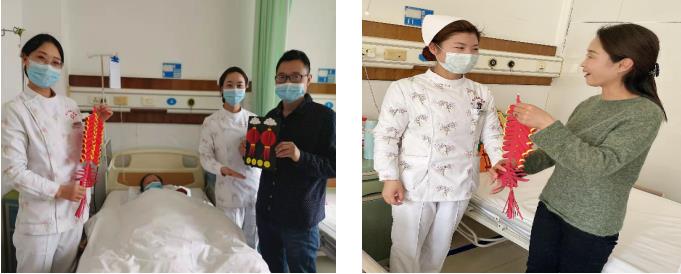农历腊月二十九早晨,主任、护士长带领着科室医护人员将程敏护士为科室的每一位患者送上自己亲手做的新年贺卡、象征着红红火火的鞭炮、万物春临的春字、可爱的小牛为患者送上这些手工艺品,患者及家属激动的说到:丫头谢谢你,我真的太感动了,你们就像是我的亲闺女一样。“这是我患病以来过的最有意义的新年!”看着患者们脸上洋溢着开心的笑容,听着他们一句句真诚的话语,顿时觉得我们所做的努力都值得,你们的满意就是对我们工作的最大肯定和认可,创建和谐的医患关系,视病人如亲人是我们一直秉承的行医原则。一句句“新年好,祝您早日康复”“您好,牛年大吉”无不传递着真情。春节的爱心关怀只是一个缩影,爱心将永远传递下去。