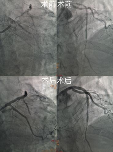 事情要从1月前开始说起,贺先生因“急性心肌梗死合并心力衰竭、心源性休克”转入了CCU病区,家属还在回忆着当时贺先生大口喘着气,憋得颜面发紫,全身大汗,情况非常危急,CCU的护士对这样的场景已经是再熟悉不过来,立即给予监测生命体征,建立生命通路,准备呼吸机,工作在有条不紊的进行着……“血压80/50mmHg,血氧饱和度为81%!”护士第一时间向医生汇报了情况,有着丰富急诊手术经验的李新国主任再次对患者病情进行了评估,目前急性广泛前壁、右室心肌梗死合并心源性休克,冠脉造影提示,冠脉三支血管严重病变,左主干80%狭窄,前降支近段99%狭窄,第一对角近段90%狭窄,中段95%狭窄;前降支中段90%狭窄,远段100%闭塞;右冠全程弥漫性病变,最重90%狭窄,房室支近段100%闭塞。虽然有外科搭桥的指征,但目前心肌梗死的急性期同时合并严重的心衰,外科开胸手术的难度和风险是可想而知的。介入手术开通罪犯血管可能是患者能存活下去的唯一机会,但与此同时也存在着巨大的风险,李新国主任及蔡婉君主管医生再次与家属沟通,告知手术的必要性及存在的风险,家属心急如焚,一时间很难做出决定。李主任耐心的把目前患者的情况,介入手术治疗的方案,及可能出现情况的预案,与家属做了详细的介绍,医患之间良好的沟通使患者及家属焦虑的情绪逐渐缓解,也重新树立起战胜病魔的决心,面对这位年经、知识渊博、技术精湛的主任,家属毅然选择了信任,签下了手术知情同意书,同时也把抢救患者生命的最后一线生机交付给了延安大学咸阳医院。