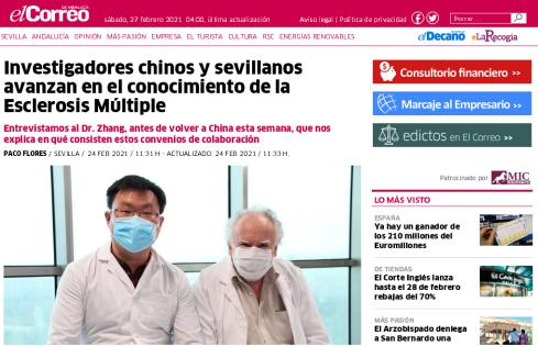 2021年2月24日我院西班牙留学博士张国勋接受安达卢西亚邮报记者的采访,对中国和塞维利亚的研究人员在多发性硬化症方面取得的进展做进一步交流。