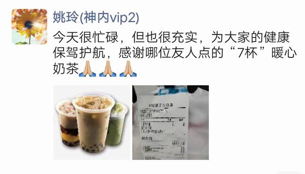 这样的事情在大年初五的时候也发生过,患者家属点了七杯暖心的奶茶送到了办公室,经过一番问询也未可知是哪位好心人,谢谢你们对我们工作的肯定!