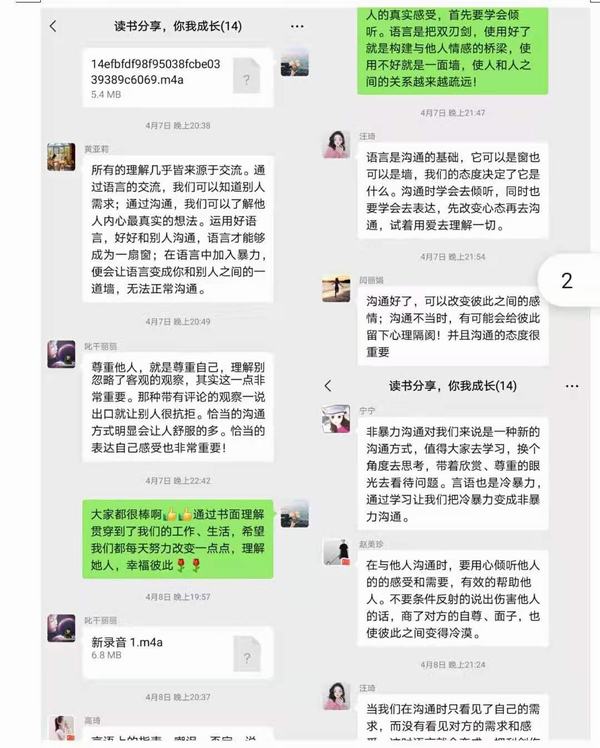 生活中人与人之间最少不了的便是沟通,为了让沟通不再是生活及工作中的矛盾,神经内科六病区张文静护士长在护理部的推荐下特意将《非暴力沟通》这本书带给我们。下班后,我们利用自己的闲余时间,伴着悠扬的轻音乐,细细的品味及探讨。