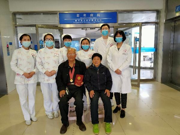 老先生是抗美援朝时期的英雄,佩戴的是2020年10月24日由中共中央颁发的中国人民志愿军抗美援朝出国作战70周年纪念章。我们亲切的称呼老人为“最可爱的英雄”,老人笑眯眯的说,你们是拥军的代表,你们也是英雄,住院期间你们无微不至的关怀与关爱,使我们的心暖了,病好了!