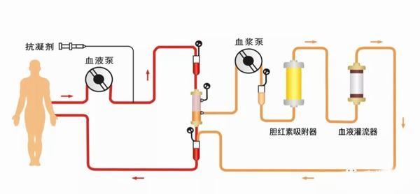 双重血浆分子吸附系统(DPMAS)采用中性大孔树脂(HA330-II)和离子交换树脂(BS330)两种吸附剂联合应用,增加体内各种毒素的清除能力,迅速改善黄疸症状的同时增强对炎性介质等有害物质的清除,提高救治成功率,改善患者预后。血浆胆红素吸附对胆红素有较强的特异性吸附作用,而对其它中小分子物质,如带负电荷的白蛋白的吸附作用较小,因此在治疗过程中,联合血浆分离起到更好的效果。选择性血浆分离器和特异性胆红素联合治疗,更多的保留了机体所需的有益成分,选择性的保留了凝血因子,不需补充大量血浆,避开了血浆来源紧张的局面,节约了宝贵的医疗资源。
