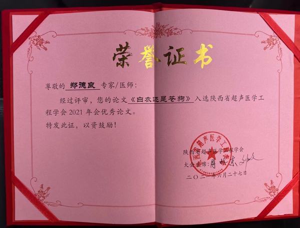 大会优秀论文汇报专场中,我院超声医学科心血管组郑德良医生的《白衣还是苍狗》一文,在青年医生数百篇参赛论文中脱颖而出,成功入选陕西省超声医学工程学会2021年会十佳优秀论文。汇报中运用杜甫的诗句“天上浮云似白衣,斯须改变如苍狗”中的“白衣”和“苍狗”分别指代心脏的良性病变粘液瘤与恶性病变横纹肌肉瘤,用真实的病例和生动的演讲为大家展示了这两者的鉴别与诊断,其突出的汇报方式受到点评专家、教授及参会者高度赞誉。