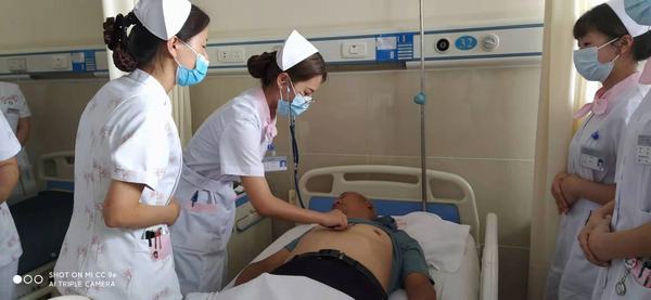 本次查房活动由党文婷总护士长主持,现场就如何做好护理教学查房进行了细致讲解,并详细介绍了本次教学查房活动的目的和意义。随后,心血管内科一病区护士长姚冲组织护理团队以一例心力衰竭患者为案例进行教学查房,采取PPT教学与现场查房相结合的教学形式,突出体现了个案护理的重点内容。通过问诊、查体、评估着手,从而给出有针对性的护理诊断,以及个性化护理措施。查体环节带教老师、实习生与患者共同进行了讨论,指出了心力衰竭患者日常自我病情监测及护理的重要性和必要性,并现场教会了患者出院后如何关注饮食、体重、运动、用药等,指导患者出现不适时紧急处理方法,现场为实习生和患者演示患者发生心力衰竭以后有效缓解不适症状的体位,整个讨论过程得到了患者的认可。最后,不同层级护士针对查房内容提出自己的疑点、困惑进行分析和探讨。