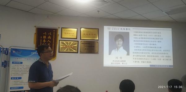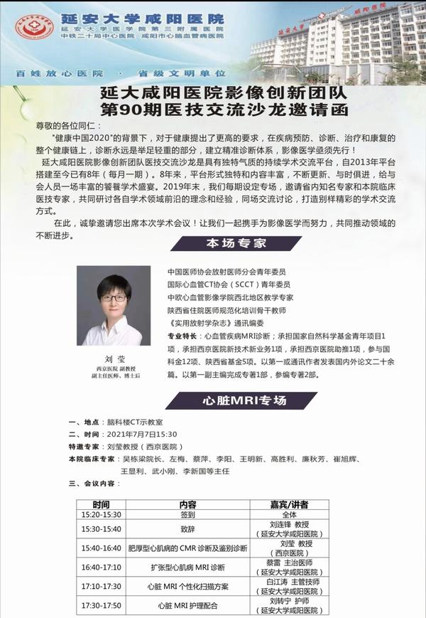 2021年7月7日,延安大学咸阳医院第90期医技交流活动在脑科楼CT/MRI示教室成功举办,会议由延安大学咸阳医院院长助理兼医学影像科主任刘连锋教授主持,特邀西京医院刘莹副教授前来授课指导,我院急诊科宋治国主任、心内3科蔡萍主任、心内5科李阳主任及心胸外科武小刚主任等临床专家参加本次活动,我院影像及临床医、技、护共40余人参加了本次会议。