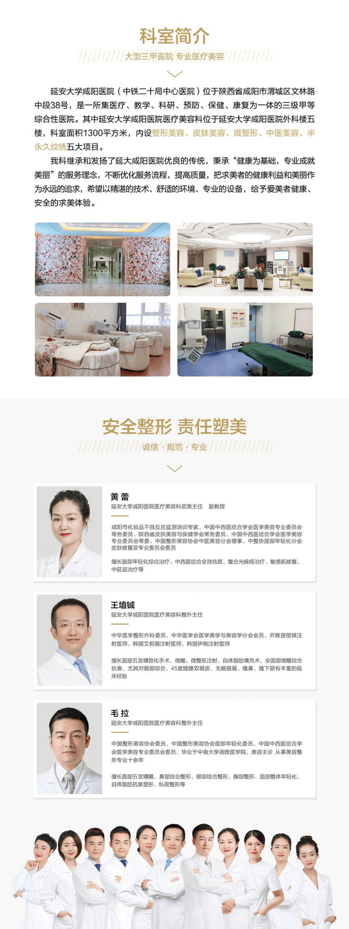 随着科技的进步和人们爱美需求的不断增高,医疗美容逐渐成为人们追求美丽的关键。而“安全整形 责任塑美”、“回归医疗本质”一直是我科坚持的理念,未来医疗美容科将继续在黄蕾主任的带领下,为医美行业规范发展上贡献出自己的一份力量,同时我科也愿与大家共同努力引导和促进医疗美容行业向诚信、科学、规范、有序的方向发展。