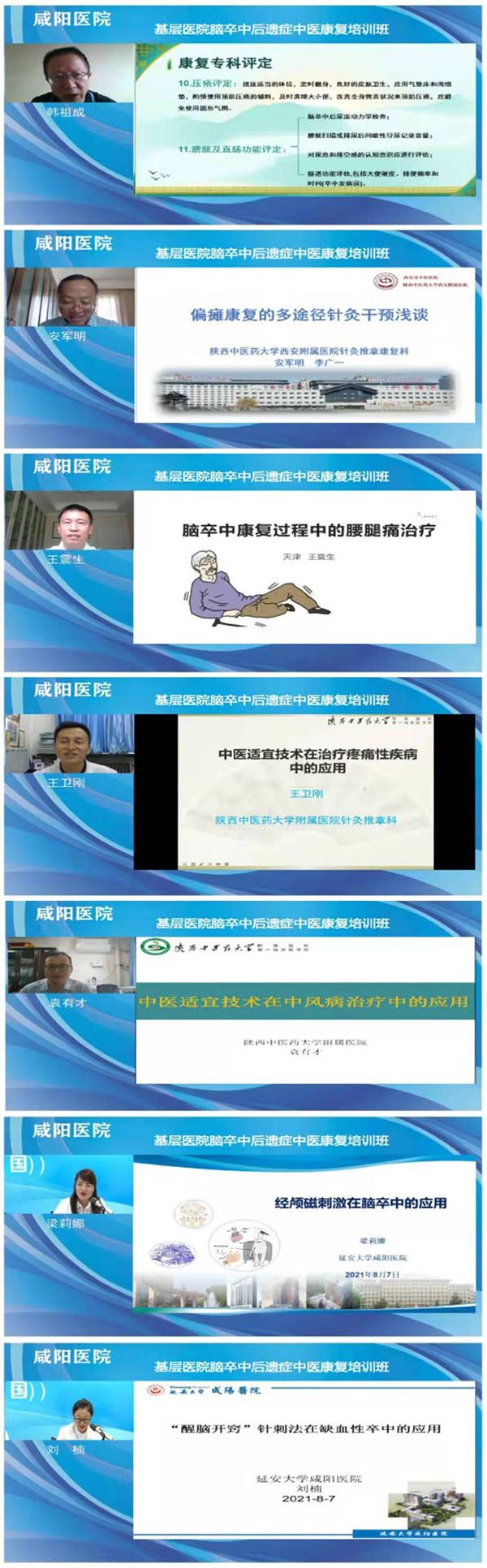 2021年8月7日,延安大学咸阳医院承办的国家继续医学教育项目“基层医院脑卒中后遗症中医康复培训班”成功召开。本次大会由延安大学咸阳医院脑血管病院慕廷民院长主持。