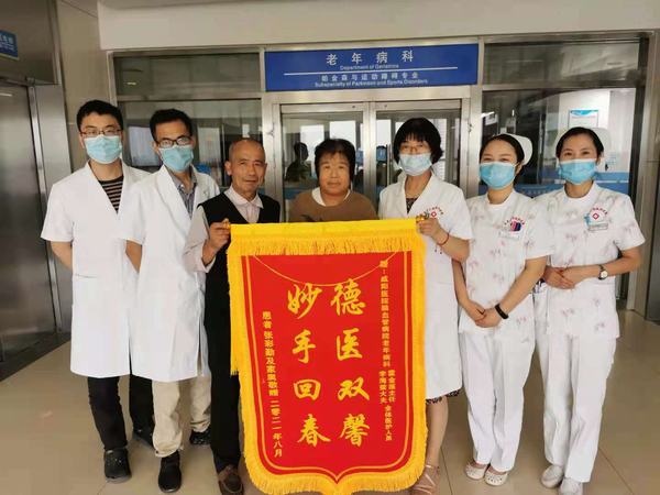 时隔半小时,又传来一阵缓慢的拐杖声。张阿姨和她的老伴申叔叔今天出院,特意做了面锦旗,送给主任和李海荣医生。感谢大家在他们住院期间,医护人员给予的治疗与护理,对治疗效果非常满意。护理人员给予的照护,让他们感受到不是亲人,却胜似亲人般的关怀。
