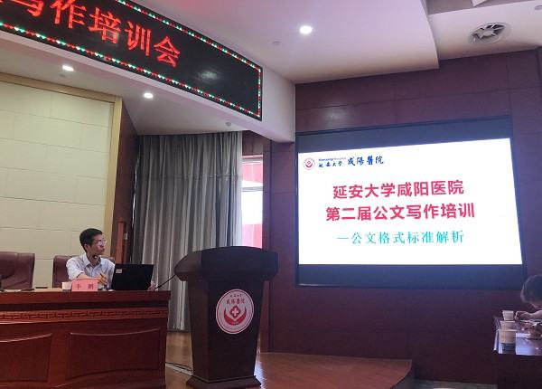 为贯彻落实集团公司规范化管理要求,加强机关队伍建设,进一步提高领导干部和管理人员的理论素养、业务水平和领导能力,提高公文处理的规范化、制度化、科学化水平,5月13日下午,延安大学咸阳医院在脑血管病院第三学术厅举办了第二届公文写作培训。此次培训以公文格式标准解析为主,培训由办公室主任李鹏授课,医院院长张海涛、副总会计师高霁,各职能部门负责人、主管、所有管理人员,各分院综合办工作人员,部分临床医技科室医护人员及通讯员百余人参加了培训。