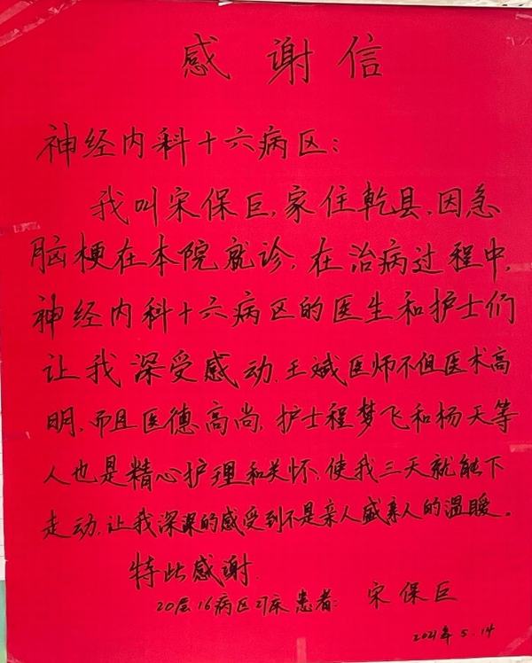 他们是入职两年的王斌医生、身怀六甲的程梦飞护士,病愈刚出院的杨天护士……,“情况各异”的他们有一个共同的代名词—青年医者,共同的初衷—医者仁心。这不,入院的17床何叔叔,时值中年,诊断为脑梗死急性期,心理的冲击可想而知,杨天护士用自己心理学方面的知识疏导患者,缓解病人的焦虑,王斌医生细致入微的询问病史,明确病因,针对性的落实治疗方案,让患者积极的面对疾病,最终得以病情好转出院。无独有偶,27床大爷,突发左侧肢体活动不能入院,还伴有糖尿病,得病初期,大爷难以接受,脾气暴躁,不愿与人交流,王斌医生就在查房过程中,向患者详细讲解病情,利用案例树立大爷医治疾病的信心,王斌医生根据基础疾病制定大爷的专属治疗方案;程梦飞护士给予大爷指导糖尿病的饮食要求,大爷年纪大,记忆力减退,为了防止大爷漏监测血糖,程梦飞护士不厌其烦的提醒大爷按时监测血糖,讲解血糖监测的重要性。温情的服务让患者如沐春风,大爷在医护人员的细心照顾下,从一开始的生活不能自理到入院3天即可缓慢行走。他们年轻,但是工作质量却没有任何缩水;他们年轻,但是优质的服务却没有折扣;他们年轻,但是医者的初心却没有任何改变。