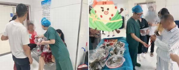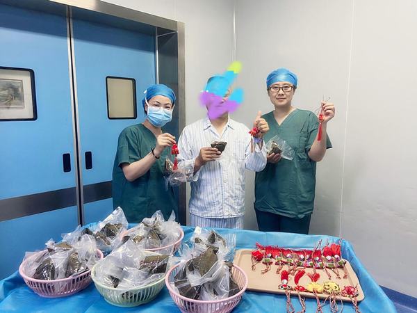 随着病员通道的自动门缓缓打开,第一名手术患者及家属被巡回护士接了进来,此时,在门口等候的手术室护士长槐金霞和谷妮娜及护士刘佳,分别为手术患者和家属递上提前准备好的香包和粽子,预祝手术成功的同时,让他们也能感受到家人般的温暖,在和病魔抗争中仍不忘爱与祝福。