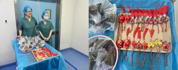 农历五月初五,是中华民族的传统佳节——端午节。2021年6月11日清晨,在我院外科楼六楼手术室病员通道门口,麻醉科/手术室的护理团队早早地就将为手术患者及家属的端午节日礼物及祝福准备就绪,粽子和各式各样的香包。