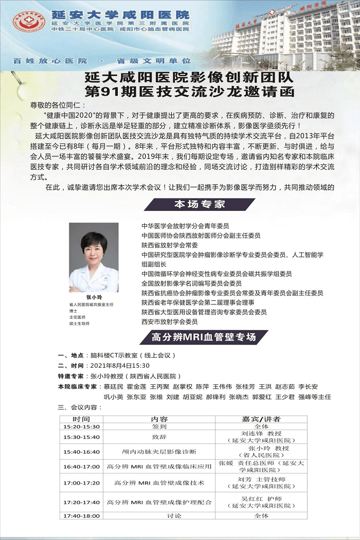 为统筹做好新冠肺炎疫情防控和“医技交流沙龙”活动的开展,2021年8月25日,延安大学咸阳医院第91期医技交流活动延迟两周后,在脑科楼CT/MRI示教室成功举办,会议采用远程设备、以线上方式进行,由延安大学咸阳医院院长助理兼医学影像科主任刘连锋教授主持,特邀陕西省人民医院磁共振室主任张小玲教授线上远程授课指导,我院神经内科十病区张东亚主任、心内VIP王显利主任等临床专家参加本次活动,我院影像及临床医、技、护共40余人参加了本次会议。
