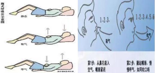 患者取舒适体位,自然放松身体,一手置于胸部,一手置于腹部,交错放置。 先用嘴快速呼气,再闭嘴经鼻慢慢深吸气,腹部处的手随之缓慢抬高。再将口唇缩成口哨状呼气,腹部处的手随着缓慢呼气而向内凹陷。 可在口唇 15 cm 处放置一点燃的蜡烛,注意呼气流量与缩唇口形大小适宜,以烛火微倾斜但不熄灭为宜,训练 3 ~ 5min,呼吸频率为 8 ~ 10 次/min,呼气与吸气时间比为 2:1。