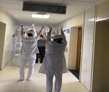 在延安大学咸阳医院内科楼三楼呼吸与危重症医学科走廊上每天下午便会出现一道亮丽的风景线。随着呼吸操节奏响起,医护人员和患者整齐排列,个个神清气爽,随着领操人员的口令∶“第一节,吸、呼……”一段有助于肺康复训练,提高呼吸系统功能的健康呼吸操就开始了!领操护士边示范边讲解道:“吸气,双臂上举,下蹲呼气……”身后患者和家属们跟随着她的动作,边做操边调整呼吸。