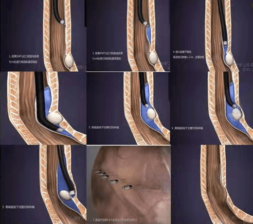 STER技术中文全称为“内镜经黏膜下隧道肿瘤切除术”,是治疗胃或食管黏膜下肿物的特色技术。STER技术可简单概括为“打隧道,挖土豆”。通过在病变口侧端3-5厘米处切开黏膜,应用内镜粘膜下剥离术(ESD)分离黏膜下层并建立黏膜下隧道直达肿瘤,充分暴露肿瘤后,在内镜直视下将肿瘤完整切除,然后经由隧道取出肿瘤,最后关闭隧道入口。要在3.5㎜厚的食管管壁上打“隧道”,取出大肿瘤,受限于黏膜下隧道的狭小空间,操作难度大,要求内镜手术医师要有精湛的内镜技术。STER既能完整切除肿瘤,又能保持消化道的完整性,降低了术后消化道瘘的出现和胸腹腔继发感染的概率,治疗效果明显,同时具有安全、微创、恢复快、并发症少等优点。我科这一新技术的开展,充分证明了我院消化内镜领域整体微创治疗的水平和实力再上一个新台阶!