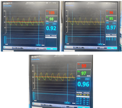 造影结果右冠多处狭窄约70-90%,左冠也是多处70-80%狭窄;对于这样一个结果,是这些狭窄造成的胸闷、心悸吗?这些病变需不需要都给予介入处理呢?一根血管植入支架还是三根血管都需要植入支架?心内九科崔旭辉主任带领介入医生团队讨论后,决定进行RFR检查给出一个明确的答案。所以经过与患者及其家属沟通后选择进行RFR检测,结果如下图: