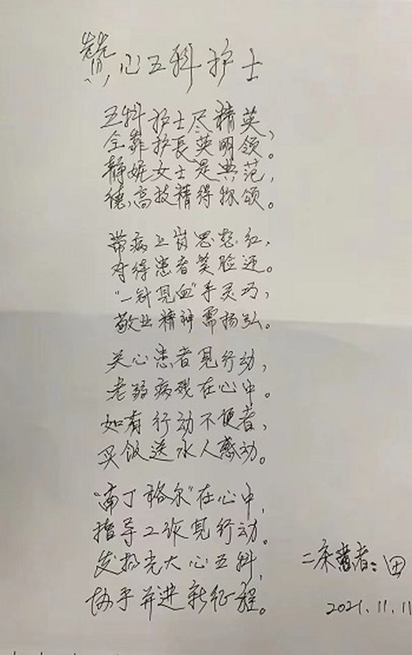 拿到表扬信大家的表情都比较惊讶,一贯觉得要求高的病人却对我们工作给予了肯定。此时我们的内心是五味陈杂,总是觉得病人要求高,那也可能是我们的付出还不够,通过此患者的护理我坚信“精诚所至 金石为开”这句话。