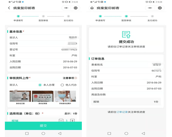 延安大学咸阳医院互联网医院病案邮寄服务是一套基于微信小程序的申请、审核、支付、复印、邮寄的管理系统,也是“互联网+医疗”的又一新举措。患者进入到“延安大学咸阳医院互联网医院”主界面后,只需在线上进行病案复印申请、微信支付、物流信息查询等简单操作,就可以获得所需复印的病案资料,真正做到了无需排队等待、随时随地申请、收费透明清晰、进度实时可查,系统还会通过手机短信提醒患者病案复印及快递的进度。