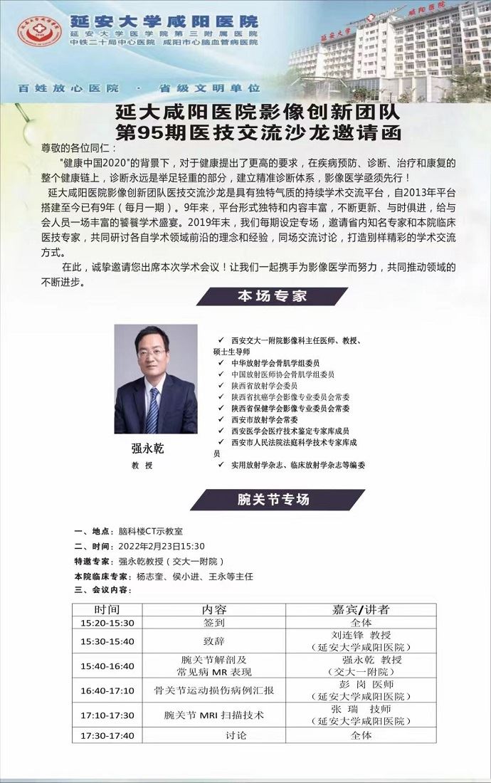没有一个冬天不可逾越,没有一个春天不会到来。疫情退散,新春伊始。2022年2月23日,延安大学咸阳医院第95期医技交流活动在脑科楼CT/MRI示教室成功举办,会议由延安大学咸阳医院院长助理兼医学影像科主任刘连锋教授主持,特邀西安交大一附院强永乾教授、我院骨一科杨志奎主任、骨二科侯晓进副主任、康复科梁莉娜副主任、功能科吴建军主任、放射科李彦龙副主任、骨二科曹熙责任总医师和北车医院影像科张涛副主任等临床、影像专家参加本次活动,我院影像及临床医、技、护共40余人参加了本次会议。