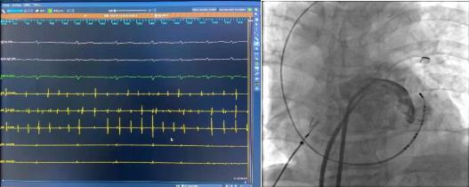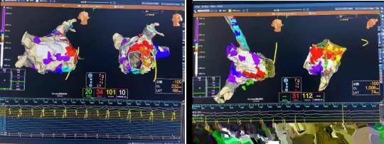 术前腔内电图可见毫无规律的房颤波,接着穿刺房间隔建立左房通路。完成肺静脉隔离及顶部线消融后房颤转复为规律的心房扑动。