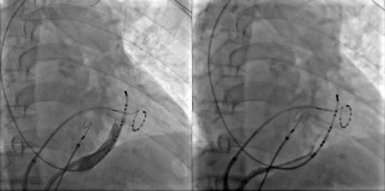 激动标测提示二尖瓣峡部依赖性房扑,而在消融过程中发现患者肌袖比较发达,进行二尖瓣峡部线性消融后不能终止房扑,结合患者情况决定进行Marshall静脉酒精消融。