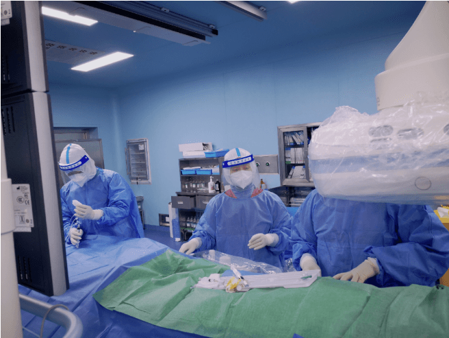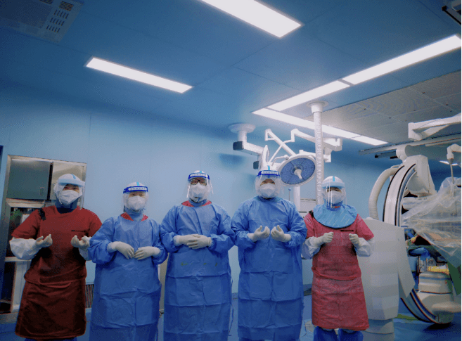 然而,3月12日晚科内两名冠心病患者频繁发生心绞痛、用药后效果十分不理想,当下考虑为ACS,血管可能有重度狭窄,随时病情可能会进一步演变而危及生命。至当前为止第一轮核酸全员均为阴性,但仍不可掉以轻心。蔡主任通过微信工作群及电话向我院张海涛院长、吴栋梁院长汇报科室情况,邀请感控办杨竹杏主任及导管室曹妙云护士长等人进行线上讨论,经过分析评估并遵循咸阳市疫情防控指挥部关于疫情防控期间积极救治不同风险区域患者的要求,一致决定开通绿色通道,严格按照新冠肺炎工作流程条例为患者进行介入手术治疗,确保患者生命安全。